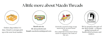 Hello, my name is Nicole — the artist behind Māedn Threads. I work with reclaimed scrap material. I cut, layer, and stitch each piece by hand and/or machine, letting the process remain visible. The artwork is slow, tactile, and intentionally imperfect.